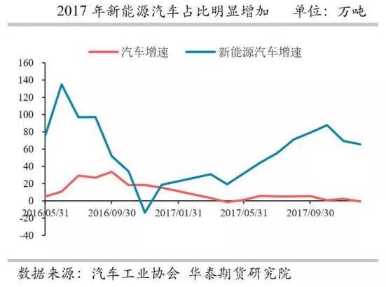 2017年,新能源汽車產(chǎn)銷均接近80萬輛,分別達(dá)到79.4萬輛和77.7萬輛,同比分別增長53.8%和53.3%。2017年新能源汽車市場占比2.7%,比上年提高了0.9個百分點(diǎn)。由于新能源汽車在節(jié)約能源有著非常大的優(yōu)勢,因此近幾年新能源汽車行業(yè)擴(kuò)張迅猛,并且對鋁制汽車部件的需求增長激增。相較于傳統(tǒng)汽車,新能源汽車采用電池作為動力驅(qū)動汽車,因而動力受電池重量、動力電池續(xù)航里程的制約,因此車身減重比傳統(tǒng)汽車更顯迫切,因此預(yù)計(jì)鋁合金材料的用量更大。