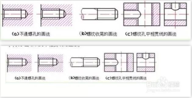 繪制不穿通的螺孔時(shí),一般應(yīng)將鉆孔的深度和螺紋部分的深度分別畫出,如圖3(a)。當(dāng)需要表示螺紋收尾時(shí),螺紋尾部的牙底用與軸線成30o的細(xì)實(shí)線表示,如圖3(b)。圖3(c)表示出螺紋孔中相貫線的畫法。