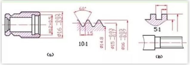 畫非標(biāo)準(zhǔn)牙型的螺紋時(shí),應(yīng)畫出螺紋牙型,并標(biāo)注出所需的尺寸及有關(guān)要求,如圖5。